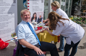 Die Sozialstation informierte in Höfingen über Pflege, Pflegeversicherung und das Hausnotrufsystem. Wer einmal probieren wollte, wie man sich (wahrscheinlich) anfühlt, wenn man mit 80 Jahren auf den Wochenmarkt geht, konnte sich mit Gewichten und Gelenkversteifungen darauf vorbereiten. Prominenter Gast beim Blutdruckmessen war der Erste Bürgermeister der Stadt Leonberg, Dr. Ulrich Vonderheid.
